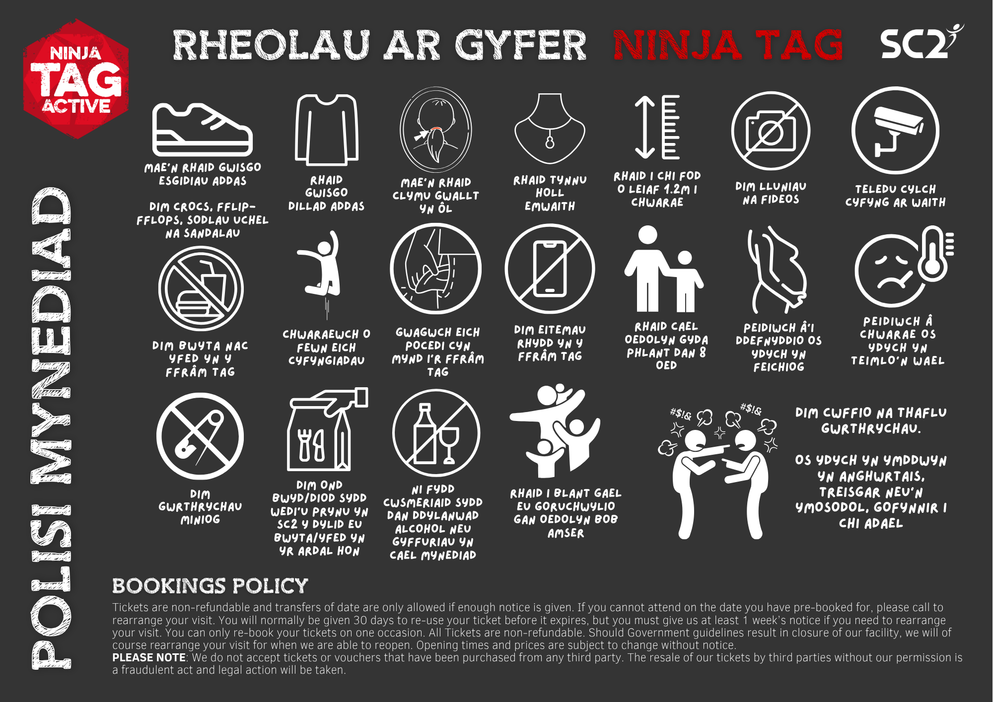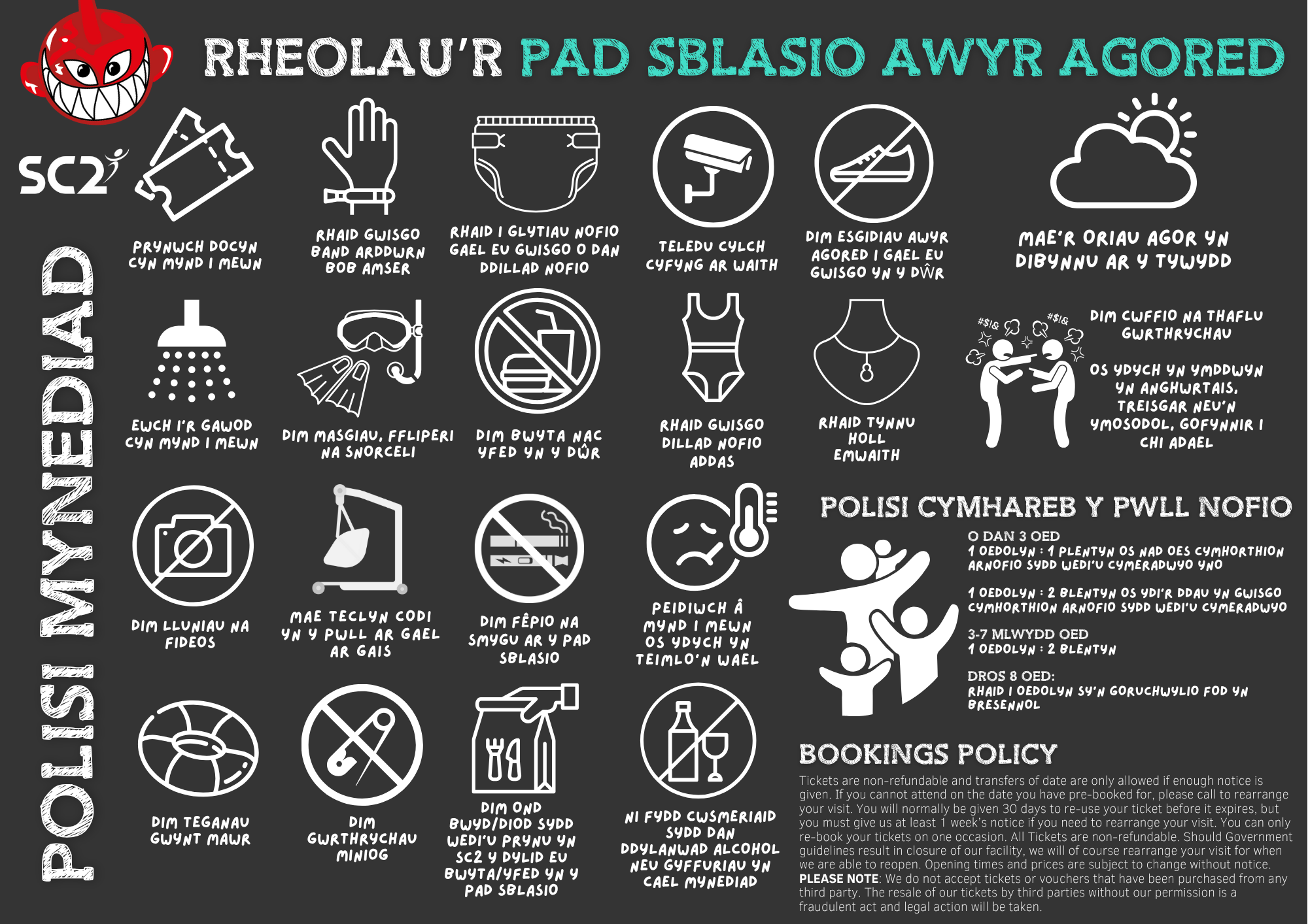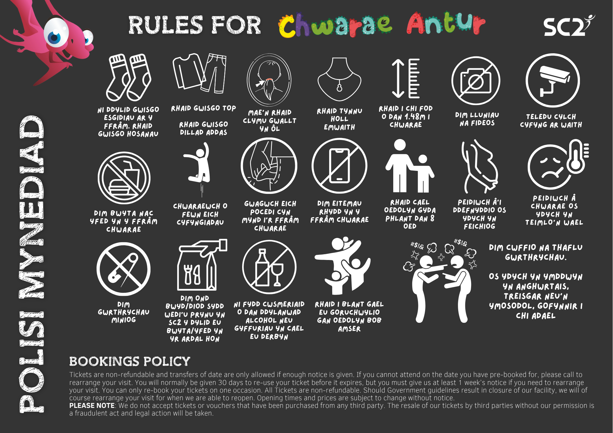 Nid yw tocynnau’n ad-daladwy, a chaniateir trosglwyddo dyddiadau os rhoddir digon o rybudd. Os nad oes modd i chi fynychu ar y dyddiad rydych wedi’i archebu, ffoniwch ni i aildrefnu eich ymweliad. Fel arfer cewch 30 diwrnod i ailddefnyddio eich tocyn cyn iddo ddod i ben, ond mae’n rhaid i chi roi wythnos o rybudd o leiaf os oes angen i chi aildrefnu eich ymweliad. Dim ond unwaith gallwch ail archebu eich tocynnau. Nid yw’r tocynnau yn ad-daladwy. Os yw canllawiau’r Llywodraeth yn arwain at gau ein cyfleuster, byddwn yn aildrefnu eich ymweliad ar gyfer pan rydym ar agor eto. Mae oriau agor a phrisiau yn amodol i newid heb rybudd.